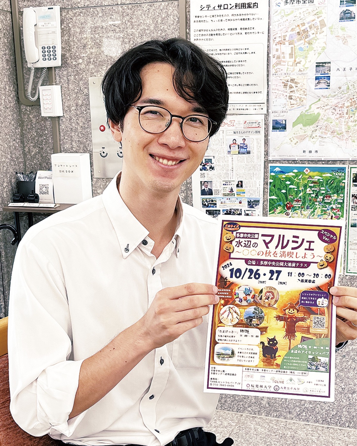 多摩センターの憩いの場・多摩中央公園の改修施工事業者からなるTAMAセントラルパークJVの代表企業に勤めながら、近隣のにぎわいを創出する連携協議会の事務局業務を担う丸山晃平さん(28)。パルテノン多摩5階に構える「クリエイティブキャンパス企画室」を中心に公園の魅力発信にも努めている。
