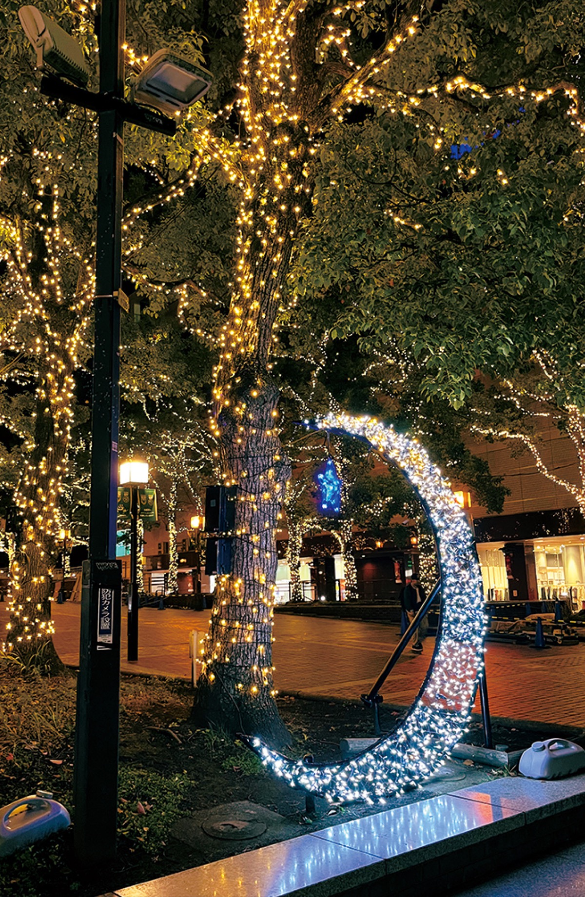 多摩センター冬の風物詩、イルミネーションが先月から点灯し始めている。パルテノン大通りを両側から彩り、約300メートルにわたりクスノキイルミネーションが輝いている=写真。クスノキイルミの点灯期間は来年2月28日(金)まで。