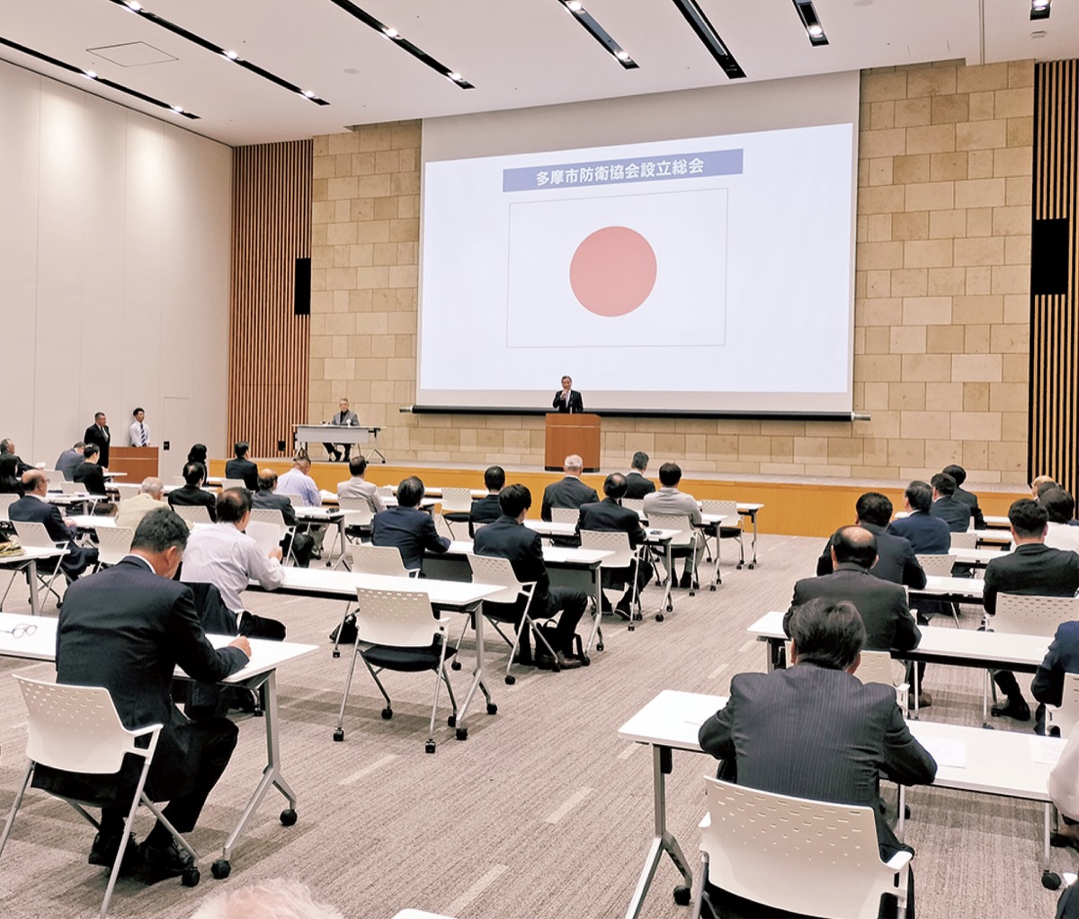 多摩市防衛協会(小礒明会長)がこのほど発足し設立総会が10月19日、リンクフォレストで開かれた。発足まで1年近く準備を進め、会社経営者や弁護士、消防団員、自治会役員など100人ほどの会員が加入した。