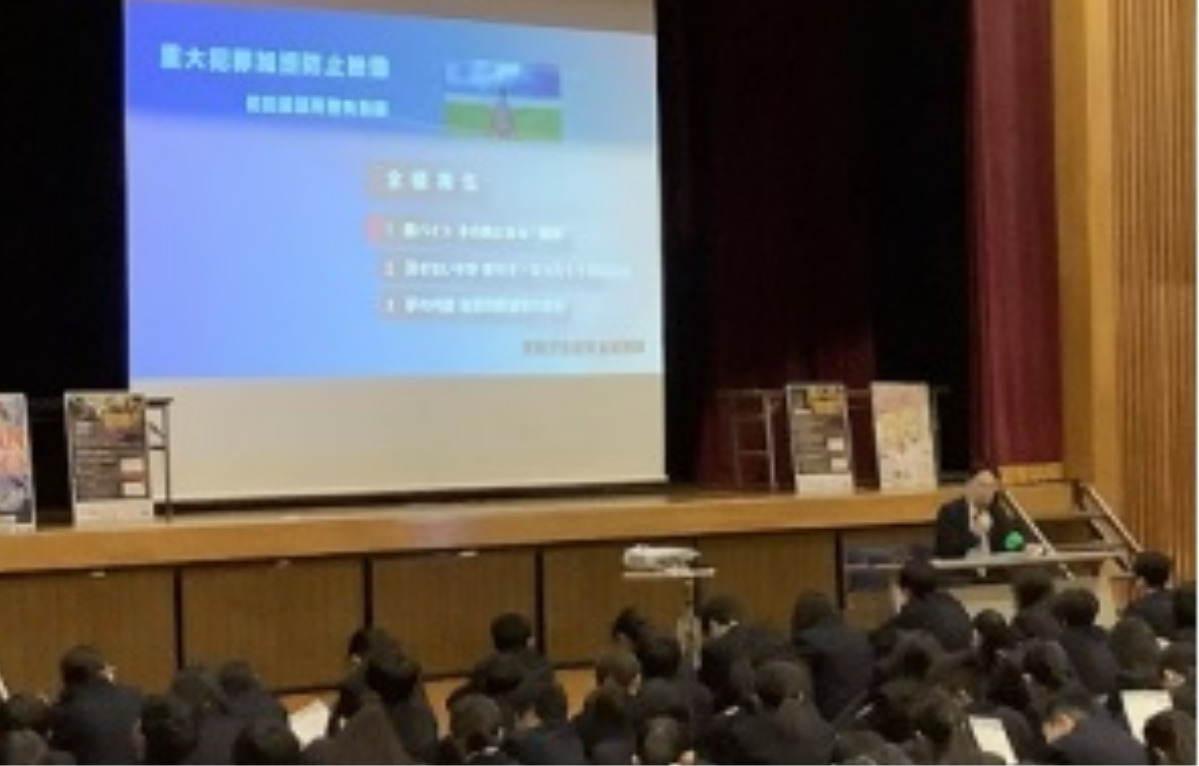 多摩市立多摩中学校でこのほど、多摩中央警察署生活安全課の署員から闇バイトの実態と手口の解説、中学生に向けた注意喚起の講演が行われた。地域学校協働本部の協力。