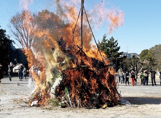 多摩市内各地の小学校や公園で1月11日から翌週にかけて、どんど焼きが行われ、一年間の無病息災などを祈った。