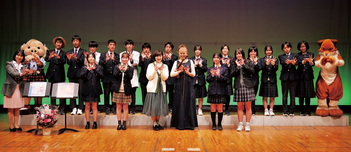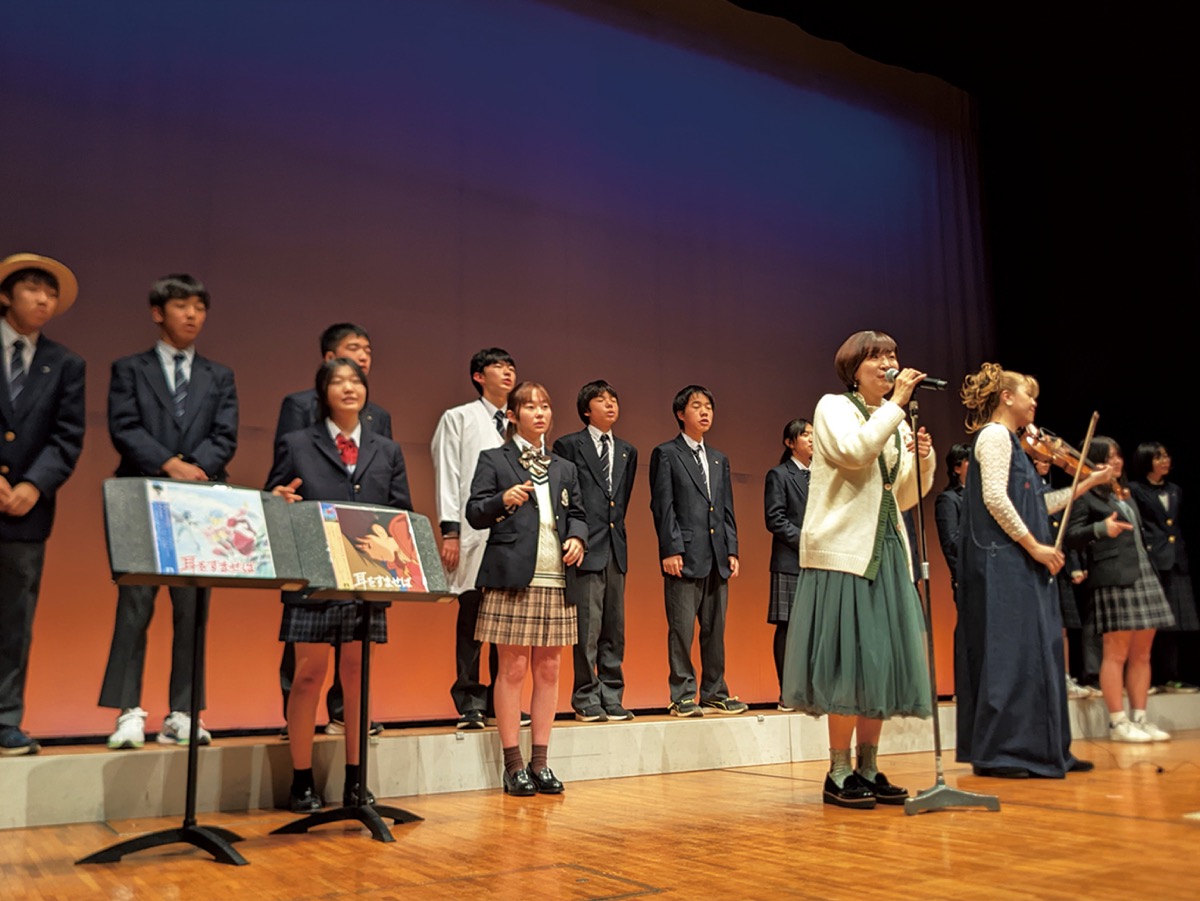 また、中学生のコーナーでは多摩中学校JRC部卒業生による手話コーラスや聖ヶ丘中学校三浦摩利教諭の司会進行で同校有志生徒による合唱、映画のワンシーンの演技があり、最後は出演者全員で来場者と共にカントリーロードで会場を盛り上げた=下写真。飯島会長は「東京近郊をはじめ、四国や九州等の遠方から来場された方もいて満員の公演となり、映画の上映30周年と第20回という節目の開催にあたり、ご支援いただいた皆さまに心より感謝申し上げます」と話していた。