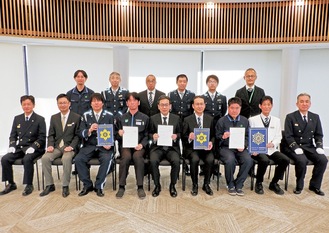 鶴牧にある宿泊研修施設「LINK FOREST」が防火対象物適合表示金マークの更新にあわせて、優良防火対象物に新たに認定されたとして、多摩消防署は同施設内で両制度の認定証交付式を行った。