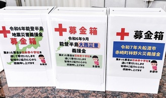 市役所1階ロビーには、能登半島地震災害義援金、能登半島大雨災害義援金の募金箱も設置されている=写真。