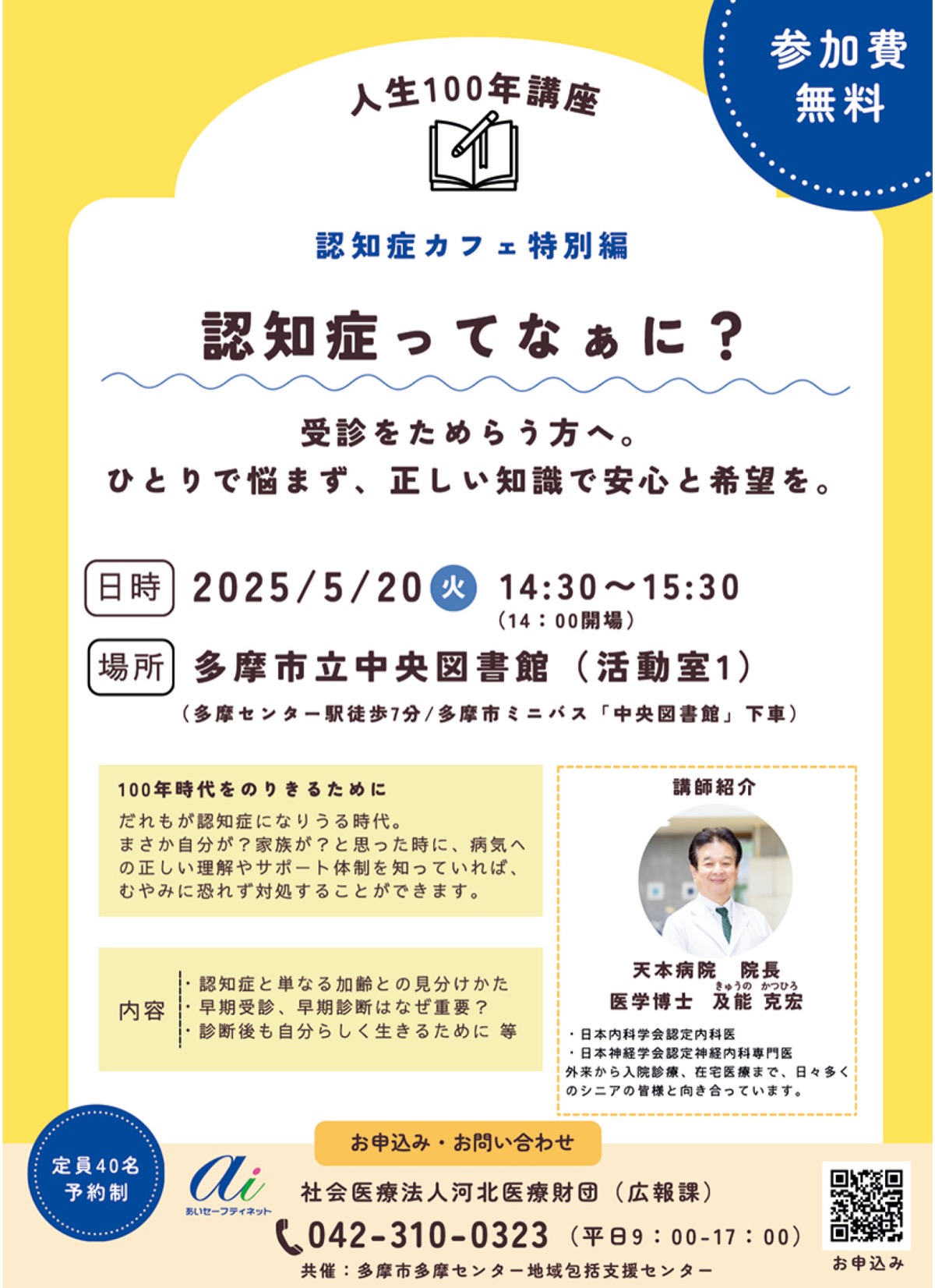人生100年講座「認知症ってなぁに?」=画像=が5月20日(火)、多摩市立中央図書館活動室1で開催される。午後2時30分から3時30分まで(2時開場)。唐木田エリアで認知症カフェを運営している社会医療法人河北医療財団と多摩市多摩センター地域包括支援センターの共催による特別編。現在、参加者を募集している。「受診をためらう方へ。ひとりで悩まず、正しい知識で安心と希望を。」をテーマとした講座。