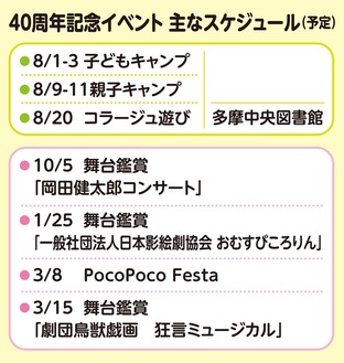 地域の子どもたちに芝居や人形劇、音楽などの鑑賞会を開き、身近な地域で生の体験の場を開いてきた認定NPO法人多摩子ども劇場が今年度、設立40周年を迎えた。同法人の春田祐子理事長によると、今年度は定期的な舞台鑑賞、キャンプ、季節ごとの催し、多摩中央図書館でのイベントなど、どれもが40周年を記念した盛大な催しにするという=表参照。