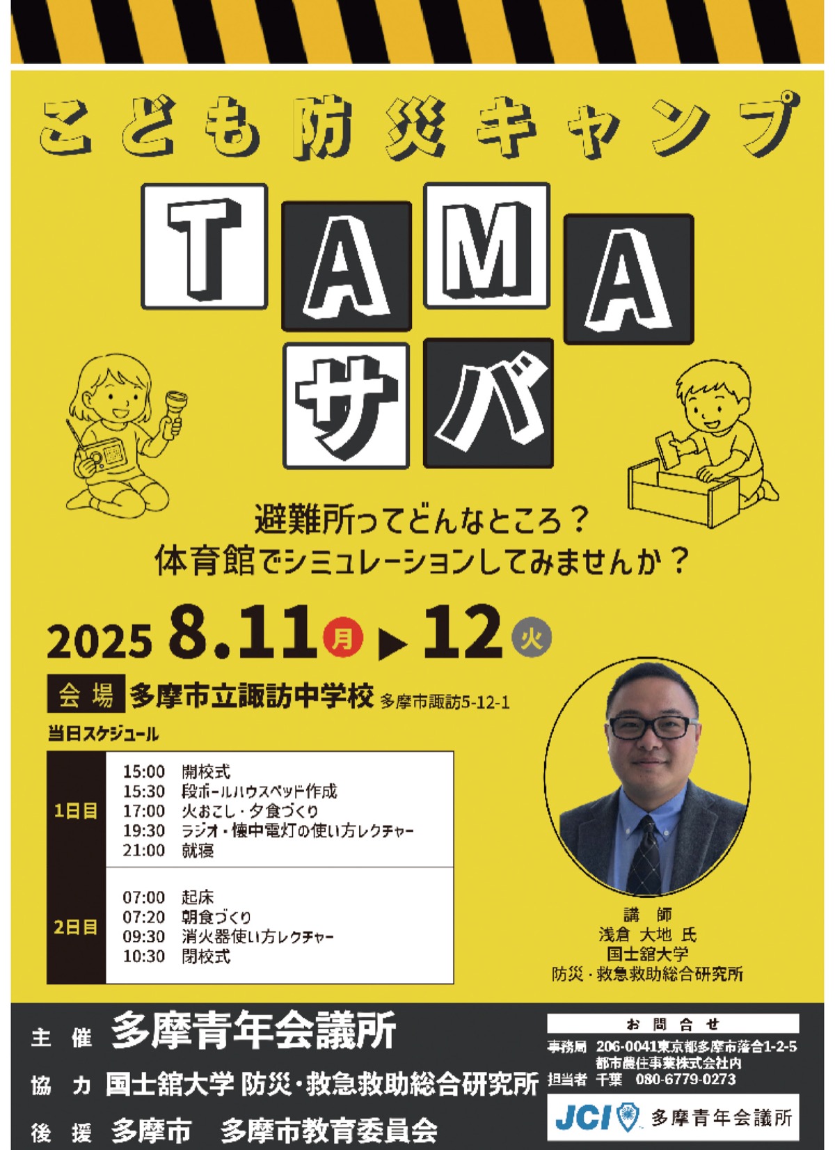 こども防災キャンプTAMAサバが8月11日(月)と12日(火)、小学生を対象に諏訪中学校で開催される。主催は多摩青年会議所(多摩JC)。現在、参加者を募集している。