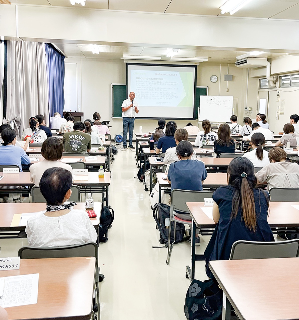 講義の後は小学校区ごとに座った教諭同士がグループを組み、自己紹介や自身の園や学校について話し合い、最初は緊張していた参加者も次第に活発な意見を出し合っていた。