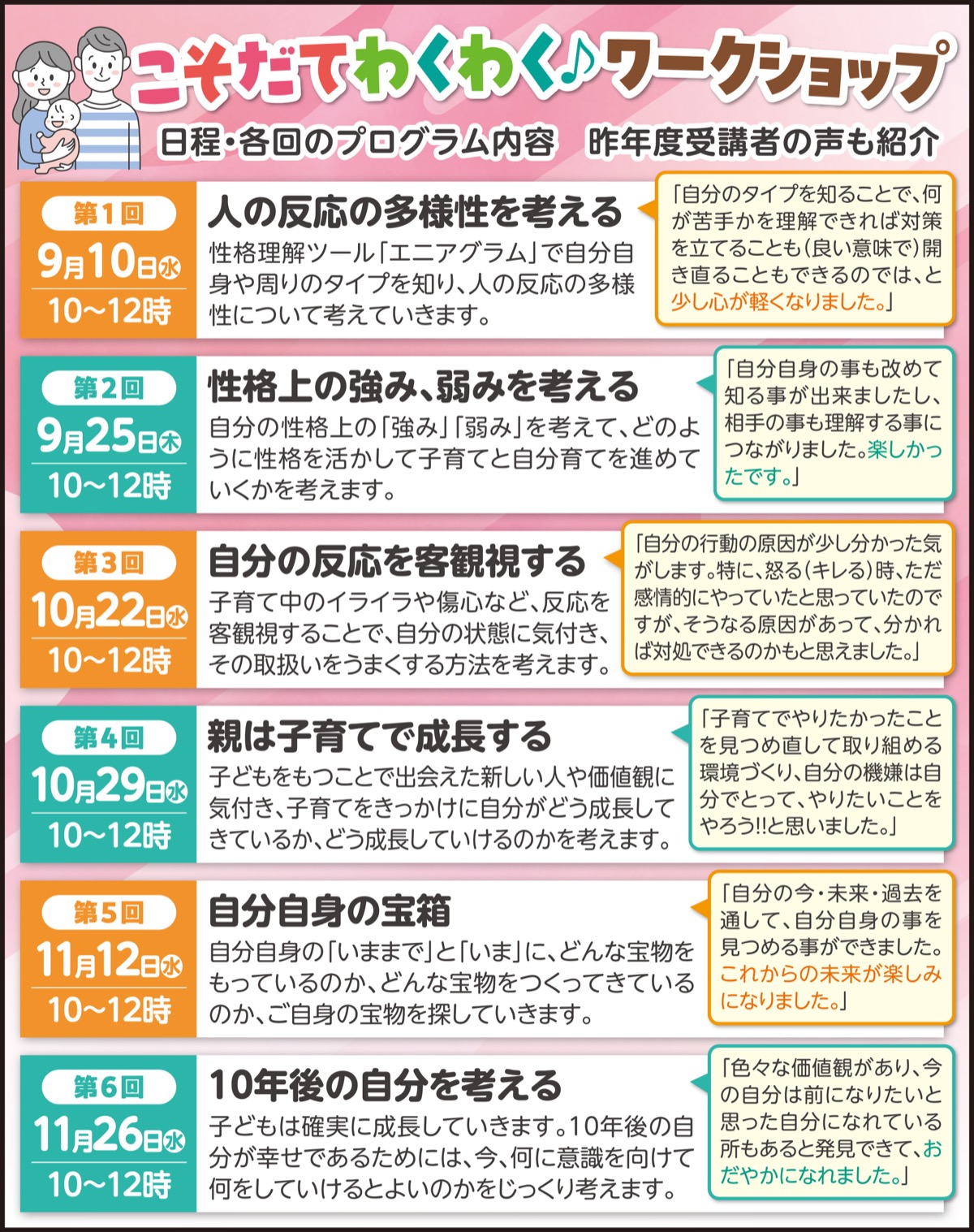 昨年度、初の試みとして全6回の「こそだてわくわく♪ワークショップ」を開催した。受講者に好評で、今年度も開催が決定した。講師は一般社団法人ビジネスエニアグラム協会の中島美暁さんが務める。性格診断ツール「エニアグラム」で自分らしさを再発見しながら、子育てや自分自身を見つめ直すことがテーマだ。