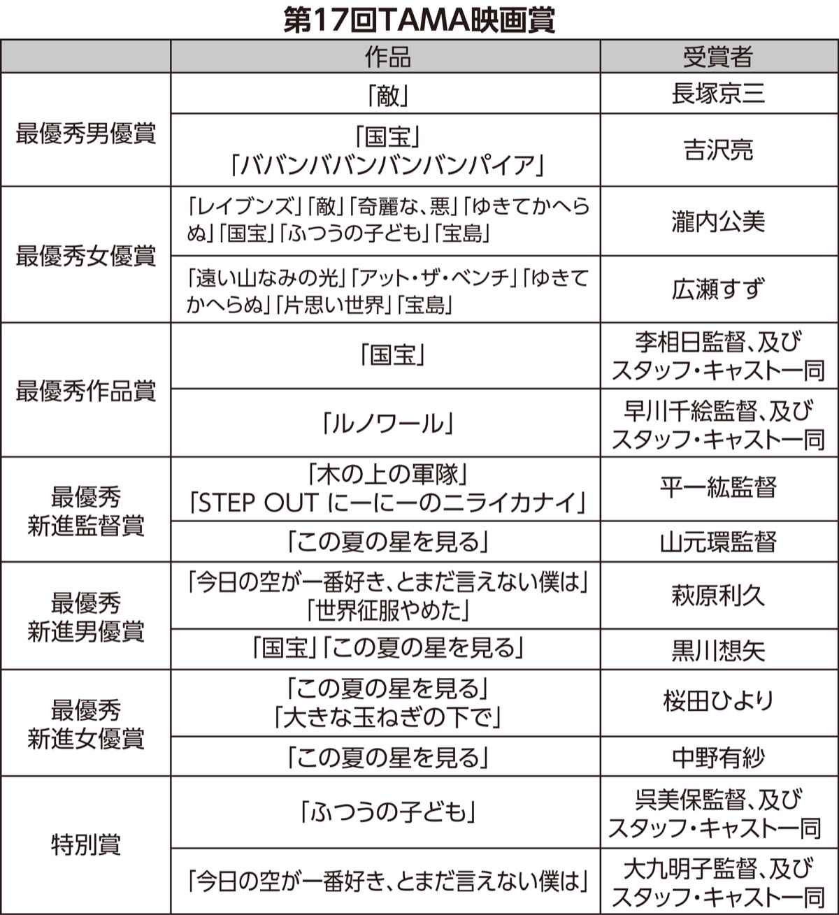 開催に先立ち、TAMA映画フォーラム実行委員会は、第17回TAMA映画賞の受賞作品・受賞者を発表した。国内でもいち早く、年内の作品を評価する映画賞として定着しており、11月15日(土)にパルテノン多摩大ホールで映画賞授賞式が開かれる。