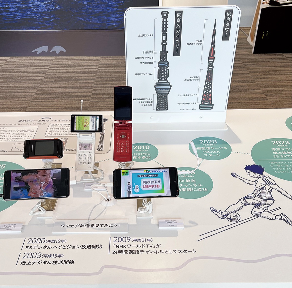 また、1934年にサービスが始まった短波無線による国際電話回線によりベルリンオリンピックの中継が実現したことや月面着陸の中継、「三笘の1mm」が有名になったサッカー・カタールワールドカップの中継など、技術の進歩や象徴的な出来事がパネル展示や放送で見ることができる。