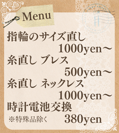 工賃も明瞭で、中間手数料などがない分リーズナブル!サイズ直し、指輪の変形、石のゆるみ、石止め直しなども丁寧に修理。