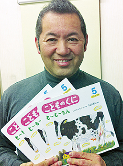 本紙でコラムを連載中の井上貴雄さん=写真が8年前に手がけた幼児向け絵本作品『も〜も〜さん』がこのほど、2〜3歳児向け月刊絵本『こどものくに〜たんぽぽ版』(すずき出版)の5月号で再版された。