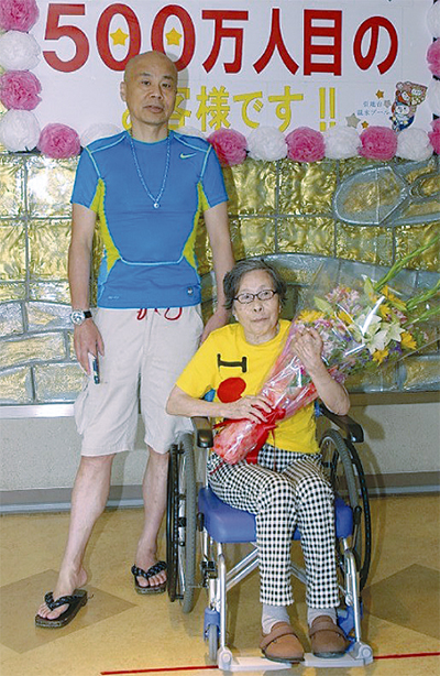 500万人目の利用者となったのは、大和市下鶴間の永鳥壽香(なが とり す が)さん(90歳)。80歳を過ぎてから水泳を習い始め、現在は息子の永鳥泰正さんと週2回ほど温水プールを利用している。
