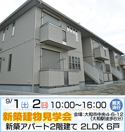 積水ハウス(株)による新築建物見学会が9月1日(土)、2日(日)に開催される。会場は大和市中央4の6の12(大和徳洲会病院近く・大和駅徒歩6分)に新築された2階建てアパート。午前10時から午後4時まで。間取りは2LDKで全6戸。