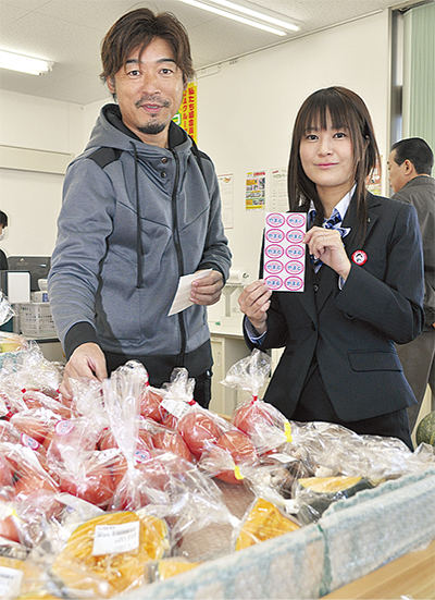 市内福田のトマト栽培農家、保田達也さん(41)=写真左=は「年末にかけてたくさんの野菜が直売所に並びます。このシールが貼ってある野菜を手に取って頂き、鮮度や味を楽しんでください」と話している。