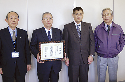 11日は運輸倉庫業部会の鈴木部会長と神作彰副部会長、下西ノ園栄一幹事が社会福祉協議会を訪れ、「交通遺児基金に役立ててください」と同協議会の高橋政勝会長に寄付金を手渡した。高橋会長から同部会に感謝状が贈られた。