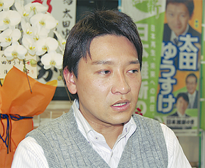 11月21日に日本維新の会からの出馬を表明した太田祐介氏(38)=写真は選挙戦を通じ「国と地方の統治機構変革」を訴えた。