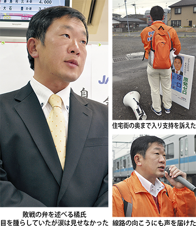 16日午後11時過ぎ、選挙事務所に姿を見せた橘氏は「勝ちは偶然。負けは必然という教えを地で行くようなことをやった。皆さんには申し訳ない気持ちで一杯」と支持者に深々と頭を下げ再起を誓った。