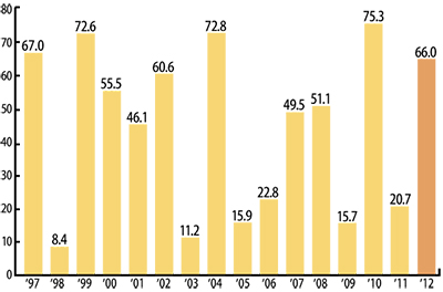 過去15年間の平年値は43点で最高値は2010年の75・3点。一昨年の2011年は20・7点。これに対し昨年11月は66点で、15年間の調査期間を通じて5番目に高い値だったことから、同センターは「飛散量が多くなる」と予想した。