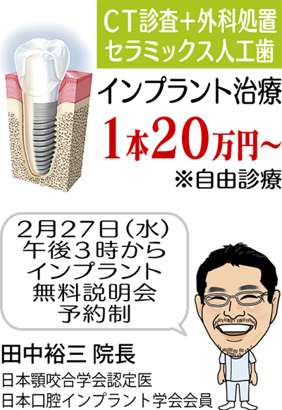 「裕デンタルクリニック」が主催する「月1インプラント無料説明会」が2月27日(水)、同院内で開催される。