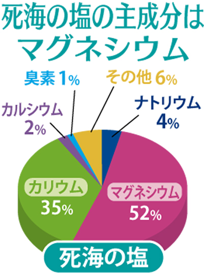 湯乃市のクレオパトラの炭酸泉には、クレオパトラが愛した死海の塩がたっぷり入っています。死海の塩は、天然の保湿成分、マグネシウムや元気のもとカリウムが主成分。炭酸泉に入浴すると、スーパー健康ホルモンといわれるアディポネクチンが増え、毛細血管を拡張し、血管のストレッチができます。