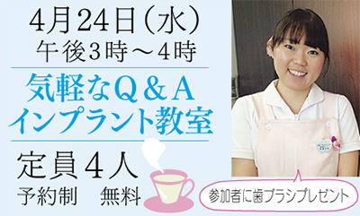 同院で4月24日(水)に、「インプラント教室」を院内で開く。本やインターネットには掲載していない現場の生の声が聞ける。希望者には後日、CT撮影付の個別相談も無料で実施中。