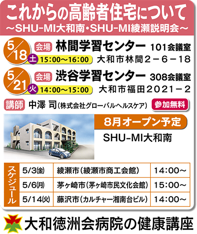 講座では、8月と10月にオープンを予定している、徳洲会グループのサービス付き高齢者向け住宅「SHU(しゅう)―MI(み)大和南」「SHU―MI綾瀬」の説明会も開かれる。この住宅は、24時間365日救急救命医療体制の大和徳洲会病院と医療連携をし、住宅と病院は送迎バスによって結ばれているというもの。