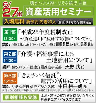 「積水ハウス」と「りそな銀行」共催による資産活用・継承セミナーが6月27日(木)に開催される。会場は、りそな銀行鶴間支店。13時30分から。参加無料。予約制で先着20人。