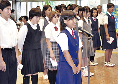 選手を代表してあいさつした下福田中学校ソフトテニス部主将の上村七菜さん(3年)は「先生、友人、家族に感謝し、大会に挑みます。精一杯頑張りますので、応援をよろしくお願いします」と話していた。