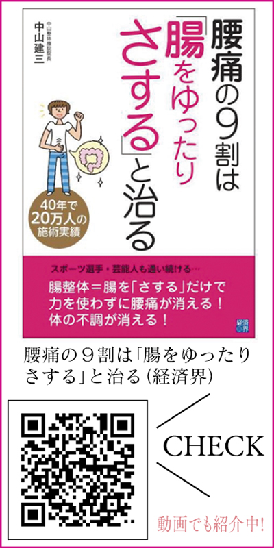 「腰痛の9割は『腸をゆったりさする』と治る」(経済界より7月25日に出版)の著者・中山建三さんが営む中山整体療院「腰痛館」(大和市中央)では今までにない手技「腸さすり」の施術が受けられる。