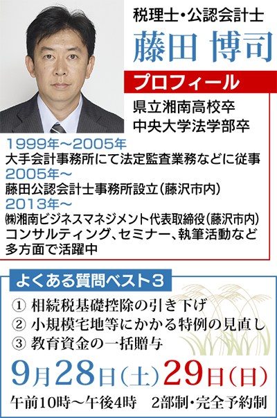 ゲストには、大手会計事務所から2005年に独立、地元の神奈川県内など首都圏各地などの幅広い分野で活動する税理士で公認会計士の藤田博司さんをお招きし、気軽に話ができる「くるま座形式」で進行し、積水ハウスのアドバイザーも参加して進行をお手伝いします。申し込み問い合わせはお気軽に!終了後の個別相談も無料でご対応。