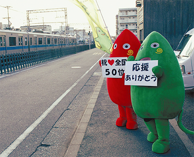 27日朝、上草柳の大和スポーツセンター前にやってきたヤマトンと友達のハートンは「応援ありがトン」などと小田急江ノ島線の乗客に向かってあいさつ。通りかかった市民からも激励を受けていた。