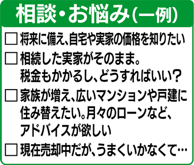 「子供が独立したので駅に近いマンションに住み替えたい」「親から相続した不動産。住まないがどうしよう」など、様々な相談が可能。問合せは気軽に。