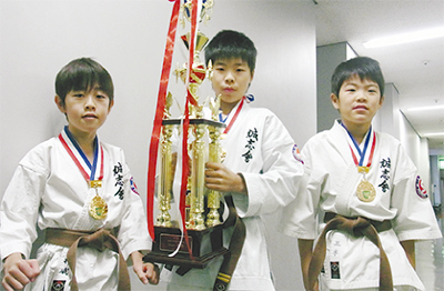 全国防具空手道連盟が主催する「第8回全国防具空手道選手権大会」が先月に藤沢市で開催され、大和市で活動する誠志会館(人見龍誠館長)所属の三木大吾君(北大和小3年・写真右)と三木元太君(北大和小5年・写真中央)兄弟が組手の部で優勝を果たした。