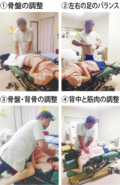 「骨盤や背骨のズレなどから痛みやしびれが生じることが多く、主にこれらのズレを調整していきます」と葛西院長。骨盤、左右の足のバランス、骨盤から背骨、背中と筋肉を調整していく、独自の施術だ。痛みを伴わないよう確認しながら施してくれる。