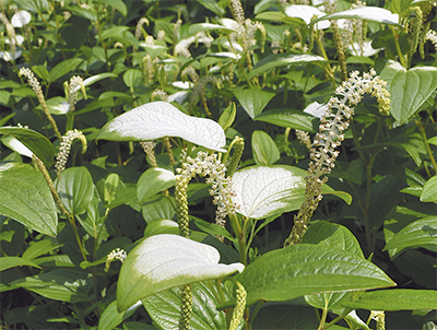 ハンゲショウは、七夕を過ぎると白さが抜け、緑の葉に戻るという。問い合わせは、自然観察センターしらかしのいえ/【電話】046・264・6633へ。