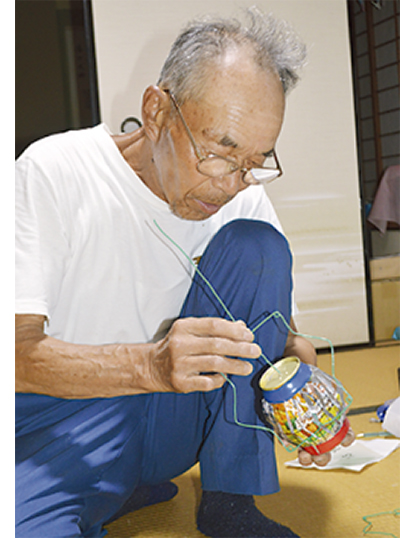 「情報が少なく調べるのに時間がかかりました」とにこやかに話してくれる夫妻。360mlビール缶の風車を作っていた人は82歳で同じ大工職人だった。作り方の詳細は聞けなかったが、清春さんは一つもらったビール缶風車をヒントに設計図を描き、試作品を作りだした。アルミ缶にカッターで15、16カ所の斜めの切れ目を入れて作り出す風車は、一つ作るのに4、5個のカッターの刃を使うという。清春さんは独自のアイデアで違うサイズの缶にも挑戦し、ひょうたん型なども作り出した。缶の風車はつくりだめをし、秋田の竿燈をイメージしたものに仕上げ、市老連の9月の作品展に出品する予定だ。