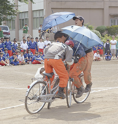 自転車交通事故の危険性を視覚と聴覚で感じてもらい、交通ルールの遵守やマナー向上を図るため、市立鶴間中学校(伊澤秀夫校長)で14日、スタントマンによる事故実演方式の交通安全教室が開催された。主催は大和市交通安全対策協議会と大和市。