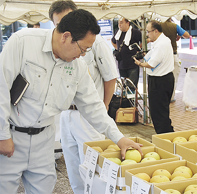 大和市、綾瀬市、海老名市、寒川町の農家が栽培した湘南梨の出来栄えを競う「第55回湘南梨品評会」が20日、大和市役所正面玄関前で開かれた。