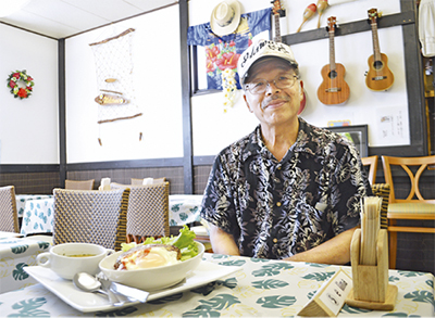「私がウクレレおじさんです」とにこやかに対応してくれたのが、店主の木村さん。ハワイアンが流れる明るい店内はご夫婦の店ならではの、ほっとできる居心地の良さが。コーヒー250円、マンゴーがベースのトロピカルジュース250円、ミニサンデー250円、とどれもリーズナブルな価格帯。日替わりランチはサラダ・スープ付きで500円。カレーや”ウクレレピザ”などもある。