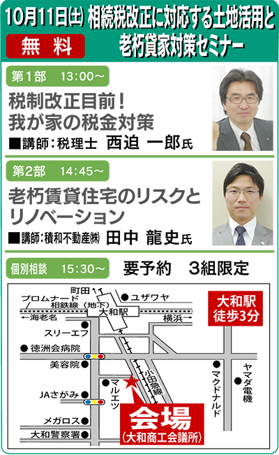 こうした中、積水ハウス(株)では10月11日(土)、土地や不動産所有者はもちろん、一般家庭の主婦も必聴の「相続&土地活用セミナー」を開催する。会場は大和商工会議所。参加費無料。