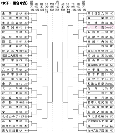 昨年11月30日に行われた組み合わせ抽選会の結果、大和南の初戦は1月5日(月)午後0時25分から、福島県代表の磐城第一に決まった。昨年の同大会でも初戦は福島県代表の郡山女子大付属と対戦。セットカウント2-1の接戦を制した。順当に勝ち進むと3回戦では昨年も激戦を繰り広げた優勝候補・熊本信愛女子と対戦する。