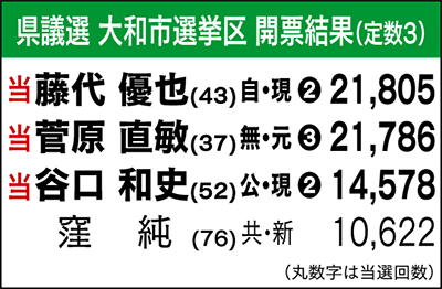 県議選(定数105)が4月12日に投開票され、新議員の顔ぶれが決まった。大和市選挙区(定数3)では、現職の藤代優也氏(43、自民)、谷口和史氏(52、公明)と元職の菅原直敏氏(37、無所属)が当選を決めた。新人で元市議の窪純氏(76、共産)は善戦したものの、一歩及ばなかった。