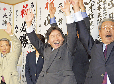 当確の報を受けた大木氏は「少子高齢社会の処方箋がないのが現状だがその解決策は目の前にあると考える。発想力、企画力をもって市民の皆様の悩みに応え前進していきたい」と述べた。