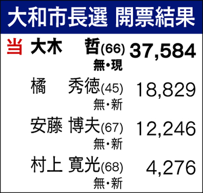 任期満了に伴う大和市長選挙が4月26日に投開票され、現職の大木哲氏(66)が新人3氏を退け3選を果たした。無所属同士の激戦は現職に軍配が上がった。