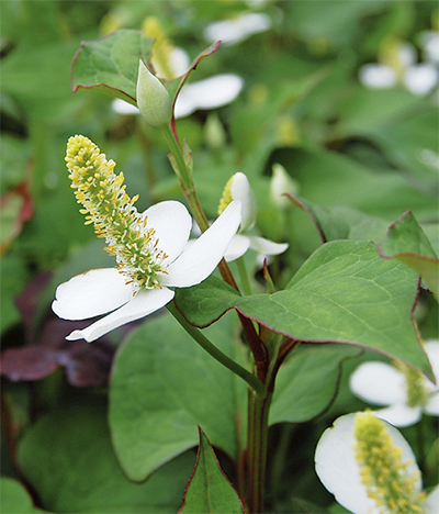 ふれあいの森(下草柳)で、ドクダミが黄色い穂状の花を咲かせている。