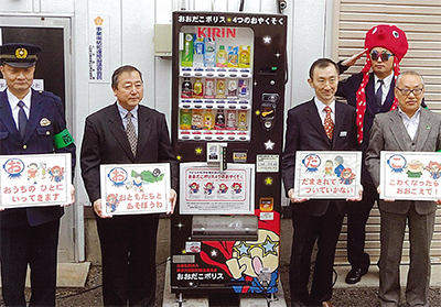 以前から防犯活動などに協力している同社が、神奈川県警本部からの提案に応じ、東京キリンビバレッジサービス(株)横浜南営業所(横浜市・玉置長春所長)とともに、防犯版のCSR(企業による社会的責任)の一環として実施した。今後、この自動販売機の売り上げの一部は、県と大和市の防犯協会に寄付され、それぞれの防犯活動に活用される。