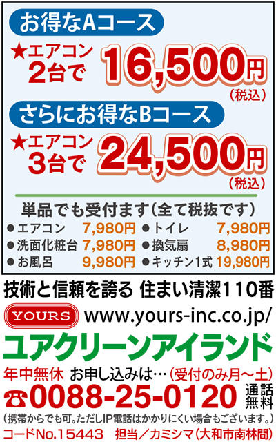 そこでお勧めなのがエアコンのクリーニング。(株)ユアーズのチェーン店として技術と信頼で定評のある『ユアクリーンアイランド』では、プロの技術でエアコン内部を徹底的に丸洗い。アレルギーのもとになるカビやホコリ、花粉を取り除くことで効率を上げ、節電にもつなげてくれる。「汚れたエアコンは、電気の無駄や体調の悪化に繋がります。本格的な夏の到来前に行うのが効果的。大型の料金などもお気軽に問い合わせください」と同社。