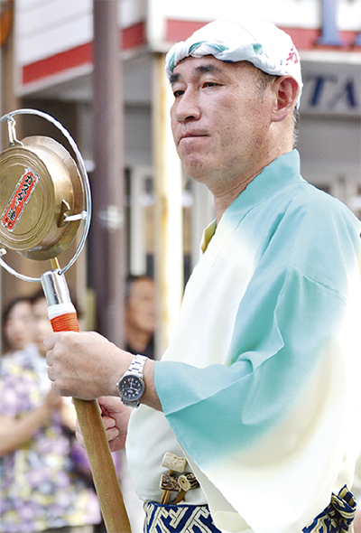 小菅連長はお囃子の鉦(かね)を担当する。指揮者のようにスピードを加減しながら息の揃った連のパフォーマンスを披露する。